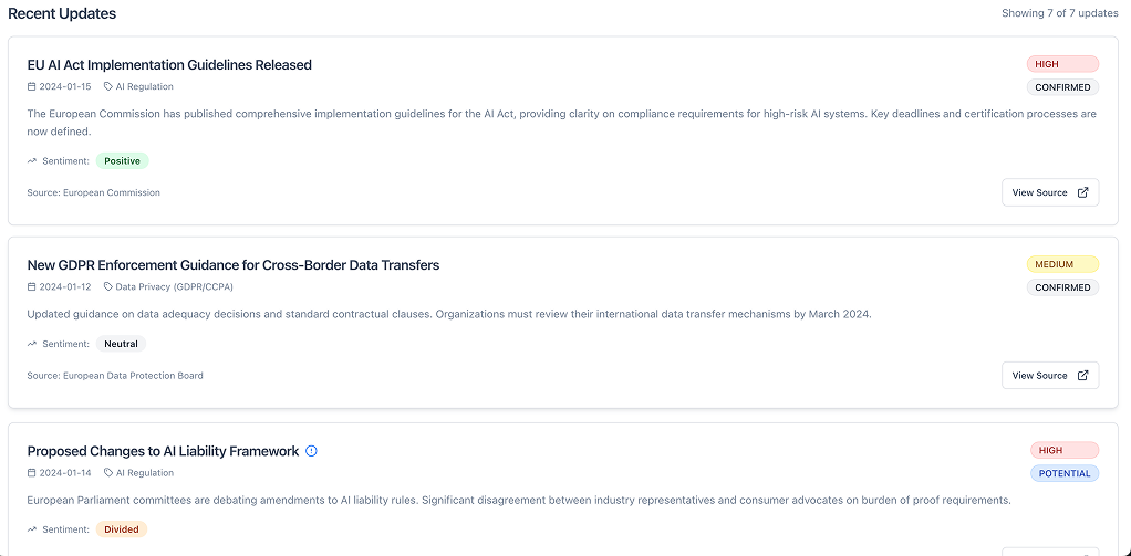 Horizon Scanner AI monitort automatisch juridische en beleidsbronnen en filtert relevante updates. Je krijgt tijdig inzicht in veranderingen die jouw organisatie raken